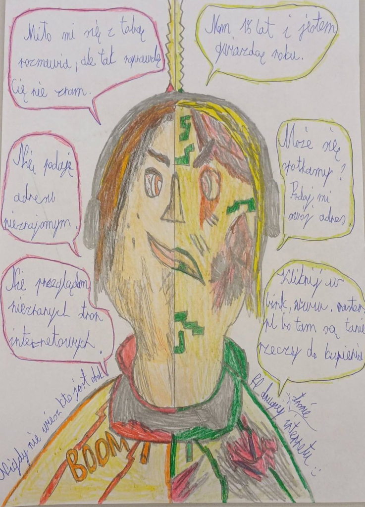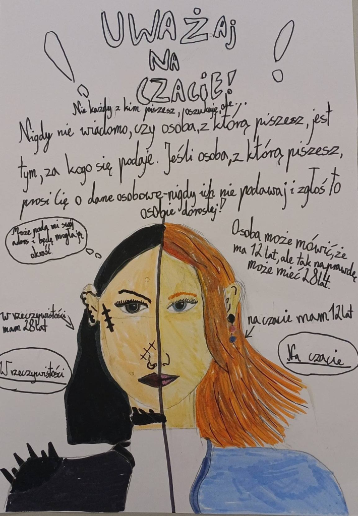 Uczniowie klasy 4c, zainspirowani lekcjami języka polskiego dotyczącymi bezpieczeństwa w internecie — szczególnie tematem zawierania znajomości online — przygotowali własne plakaty promujące właściwe zachowania w sieci.