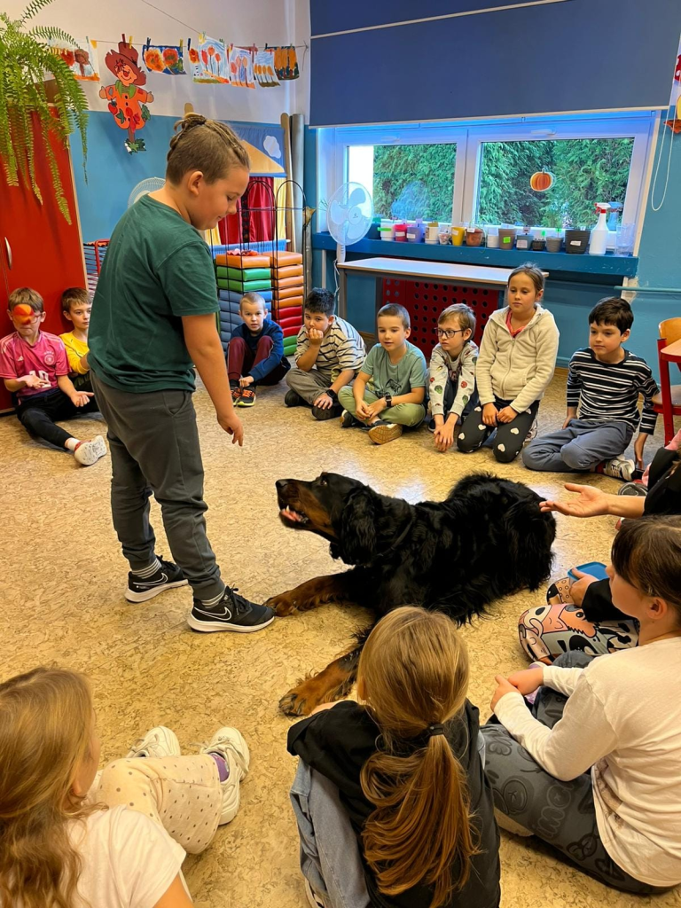 Ben szybko zdobył serca uczniów! Dzieci z zachwytem obserwowały jego sztuczki i z radością uczestniczyły w ćwiczeniach z komunikacji i współpracy.